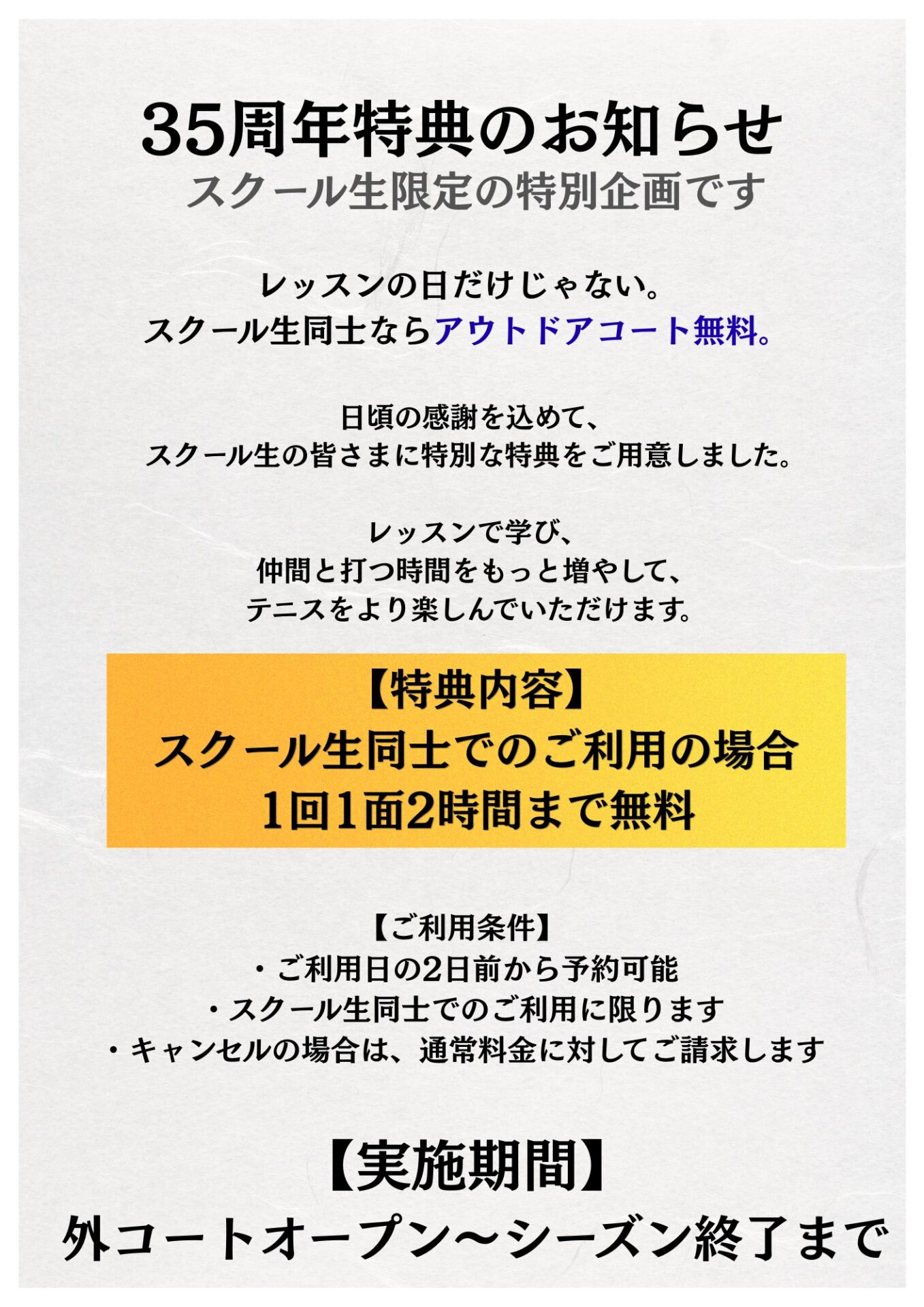 レンタル2026年4月4日【スクール生限定】35周年記念アウトドアコート無料!!