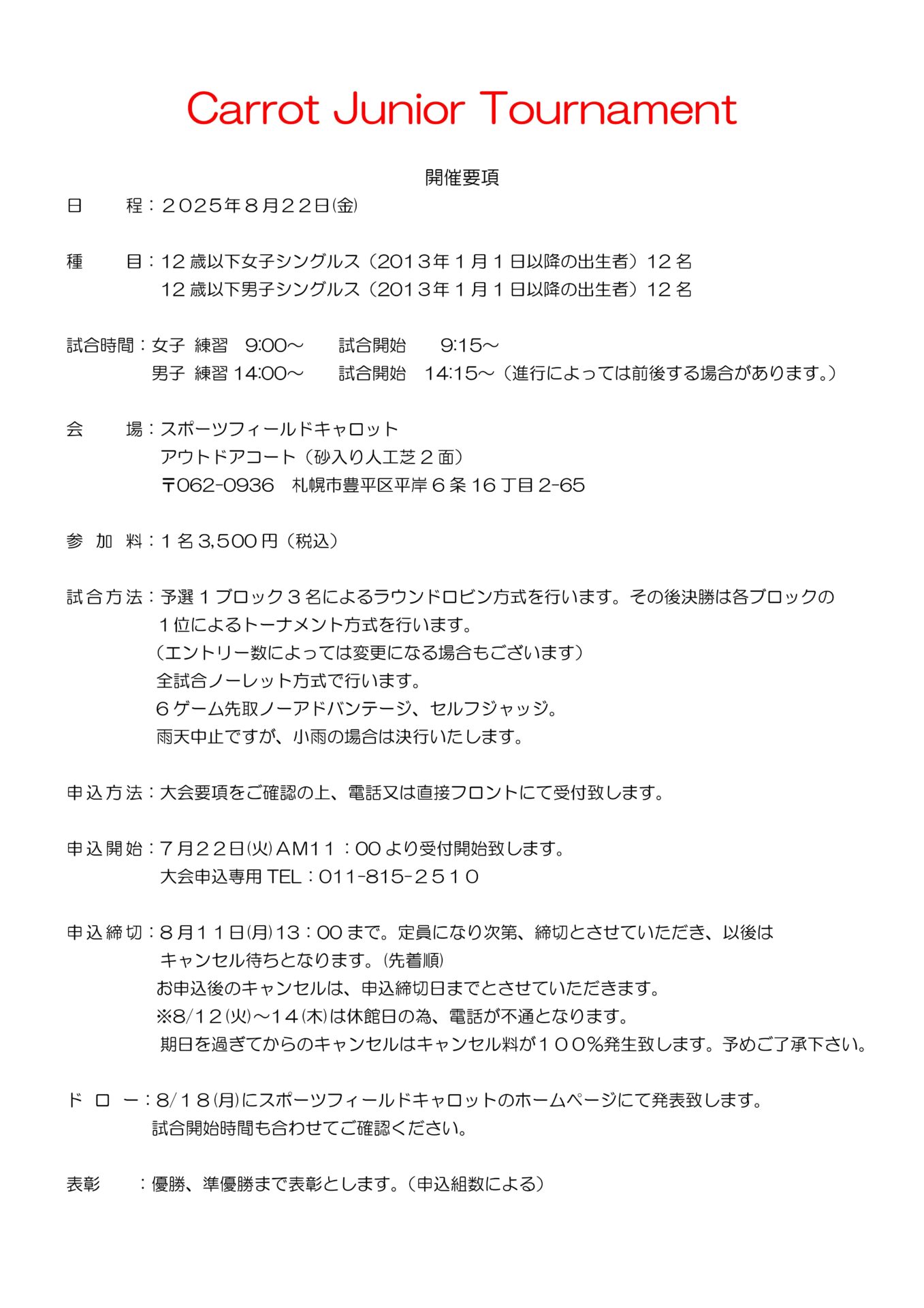 8月22日(金)アウトドアコートにて、12歳以下シングルスの大会を行います。