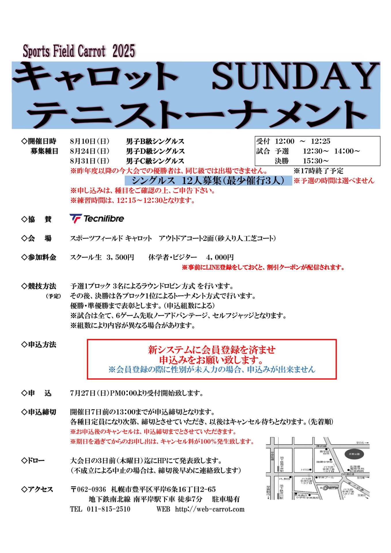 SUNDAYテニストーナメント(8月)のお知らせです。